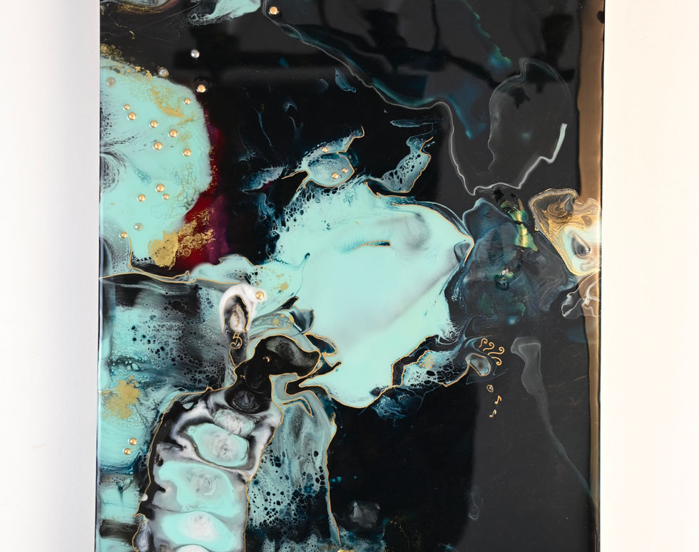 Her adjacent, commissioned body of work, ‘The Living Urn Sanctuary’, Est. in 2018, is a custom, resin wall art painting that commemorates your Loved One by incorporating their ashes directly into the painting. The Living Urn Sanctuary concept invokes a new way to remember and becomes a place of contemplation and connection to your memory of your lost Loved One. These paintings carry with them a sensitivity to beholder and their loss.