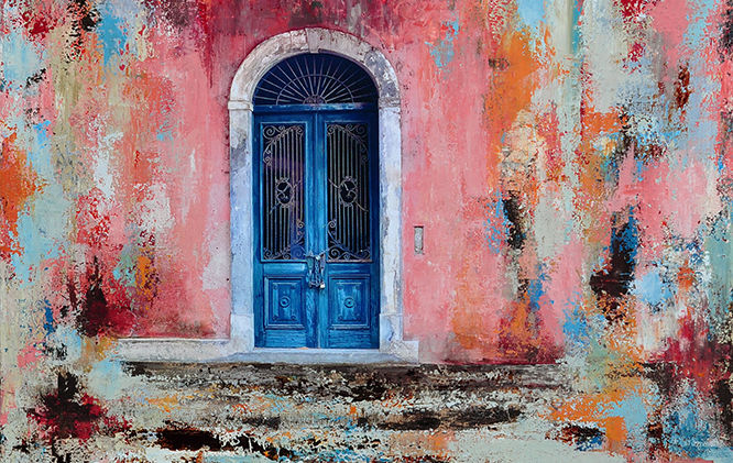 I'm driven by a deep-seated creative impulse. I draw on hope and inspiration to help me move ahead. I often take photographs of doors in the course of my travels and turn them into stunning mixed media artworks. The walls surrounding the doors are incredibly compelling, with their unique patina giving me lots of ideas for using color and layering techniques in my work. Working through these intricate details is almost like touching history itself; something that has been standing there through many years and generations conveys its own strength and resilience. Doors are much more than just a portal – they're a testament to our collective spirit.